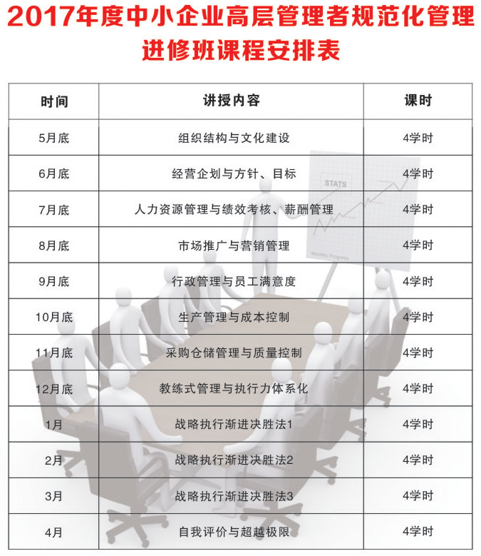 (1)每月舉行“中小企業(yè)高層管理者規(guī)范化管理進(jìn)修班”