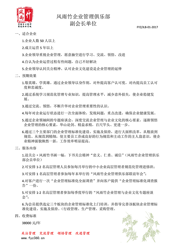 七、入會(huì)資格 愿意共同促進(jìn)企業(yè)管理水平提升,愿意參與俱樂(lè)部各類服務(wù)活動(dòng),遵守俱樂(lè)部章程,會(huì)員單位資料齊全,并與本公司簽訂“風(fēng)雨竹企業(yè)管理俱樂(lè)部入會(huì)協(xié)議”,繳納會(huì)費(fèi)后, 即為本俱樂(lè)部會(huì)員單位。