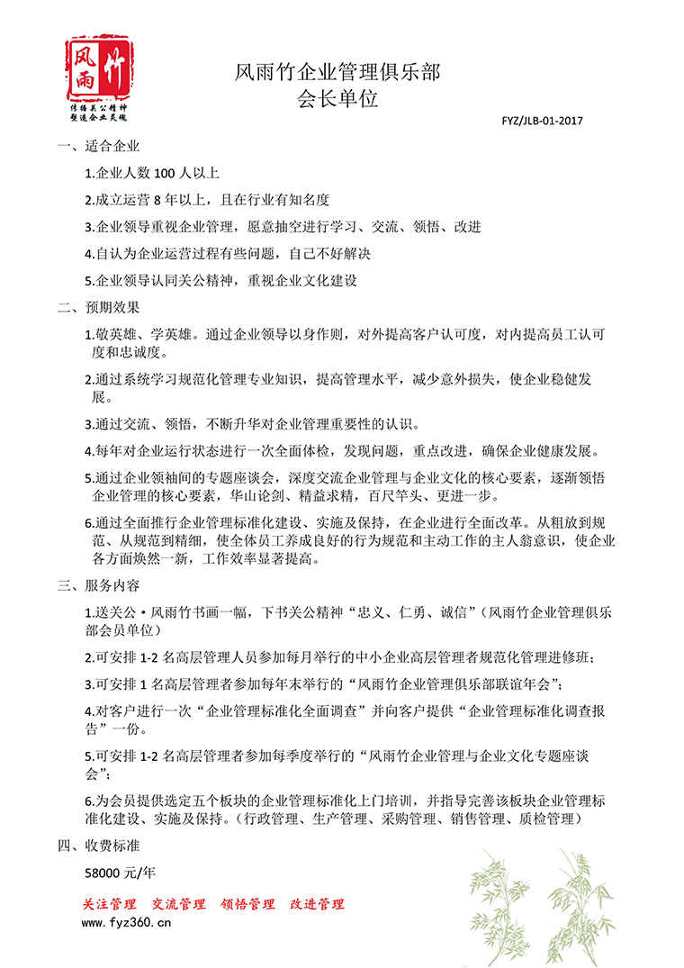 風(fēng)雨竹企業(yè)管理俱樂(lè)部(以下簡(jiǎn)稱俱樂(lè)部)是山西風(fēng)雨竹文化傳播有限公司推動(dòng)中小企業(yè)管理不斷提升,并采用“傳、幫、帶”方式不斷提高企業(yè)中高層管理者的管理水平, 真正實(shí)現(xiàn)“從管理要效益”而建立的服務(wù)平臺(tái)。