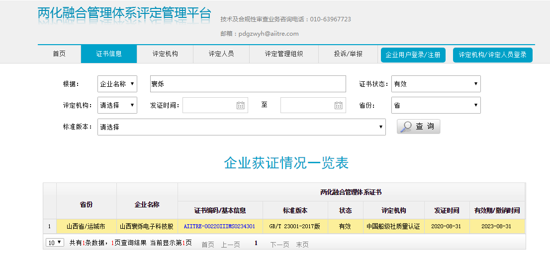 2020年8月31日,山西寰爍電子科技股份有限公司順利通過(guò)國(guó)家工業(yè)和信息化部《信息化和工業(yè)化融合管理體系要求》(GB/T 23001-2017)體系認(rèn)證,獲得由工信部審核、中國(guó)船級(jí)社質(zhì)量認(rèn)證公司簽發(fā)的兩化融合管理體系評(píng)定證書。