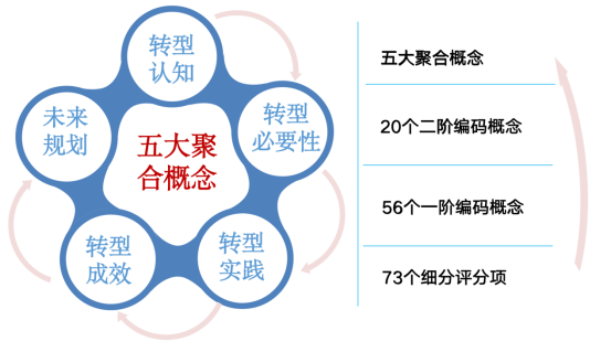我們通過編碼得到關(guān)于央企數(shù)字化轉(zhuǎn)型抽象程度最高的五個聚合概念,分別是:轉(zhuǎn)型認(rèn)知、轉(zhuǎn)型必要性理、轉(zhuǎn)型實踐、轉(zhuǎn)型成效、未來規(guī)劃。這五個聚合概念反映出央企轉(zhuǎn)型的五個重要層面,是數(shù)字化轉(zhuǎn)型的關(guān)鍵。
