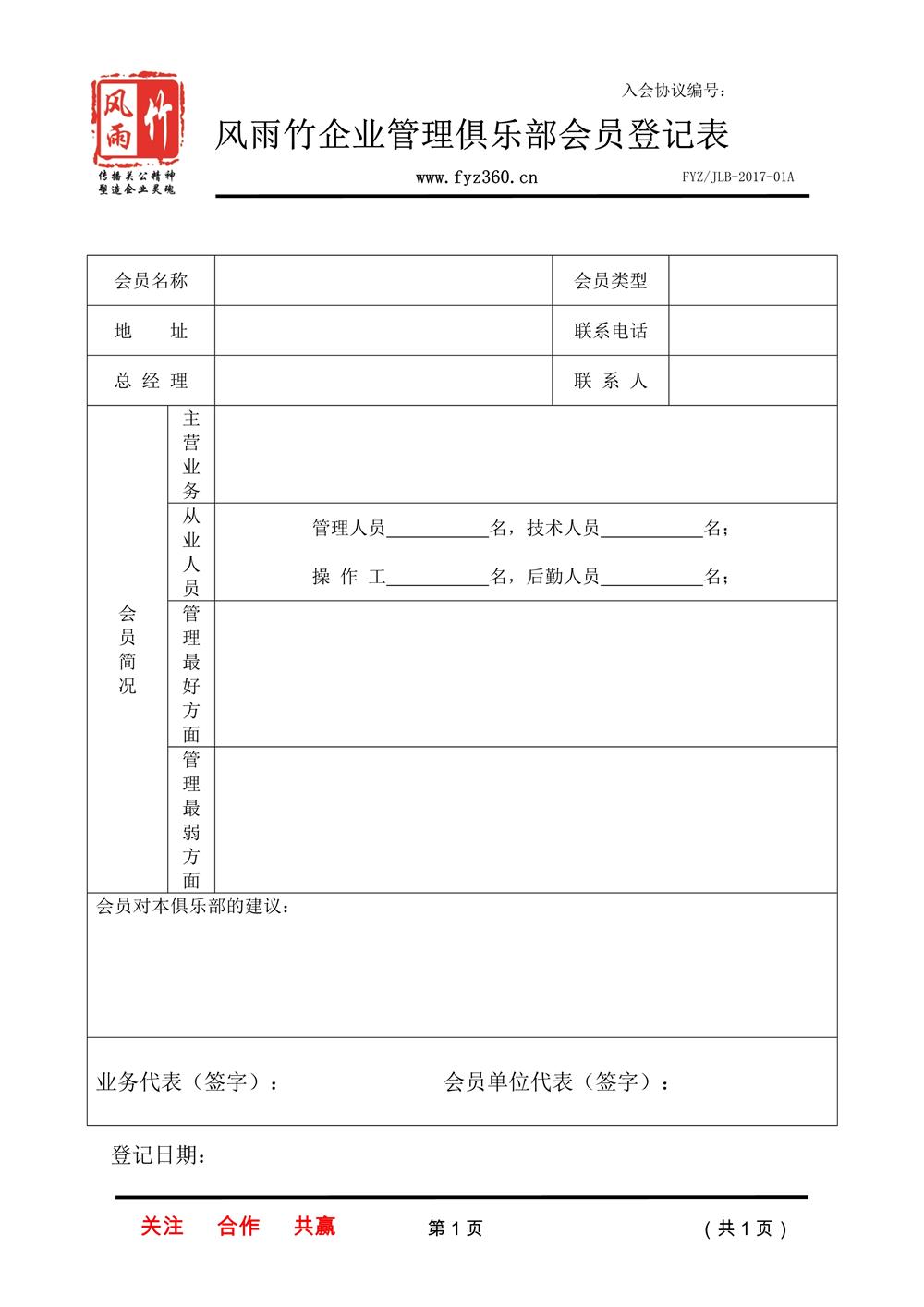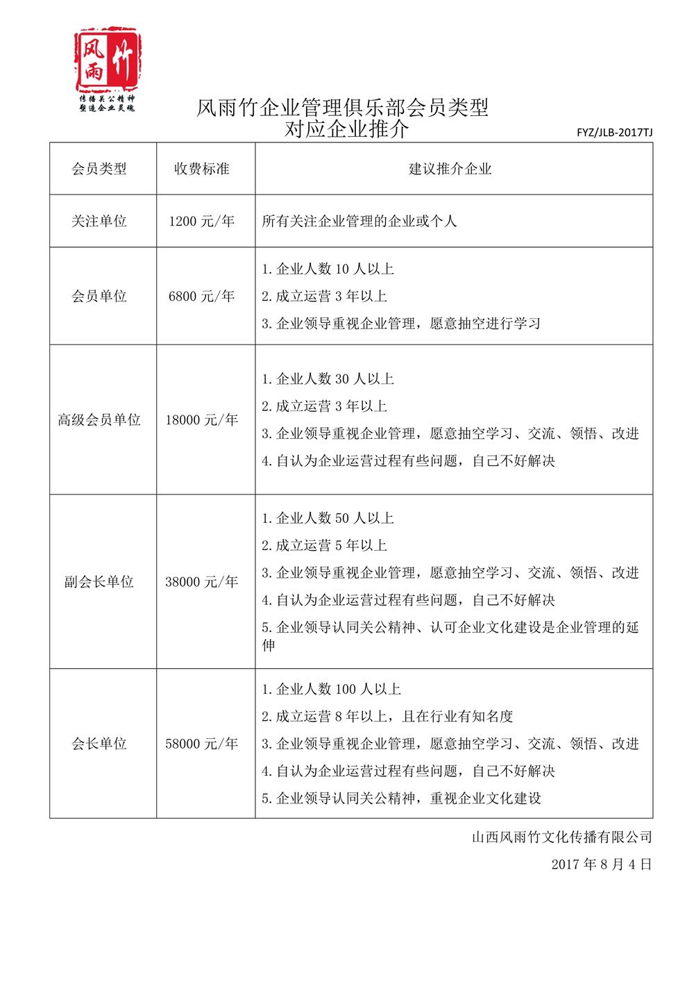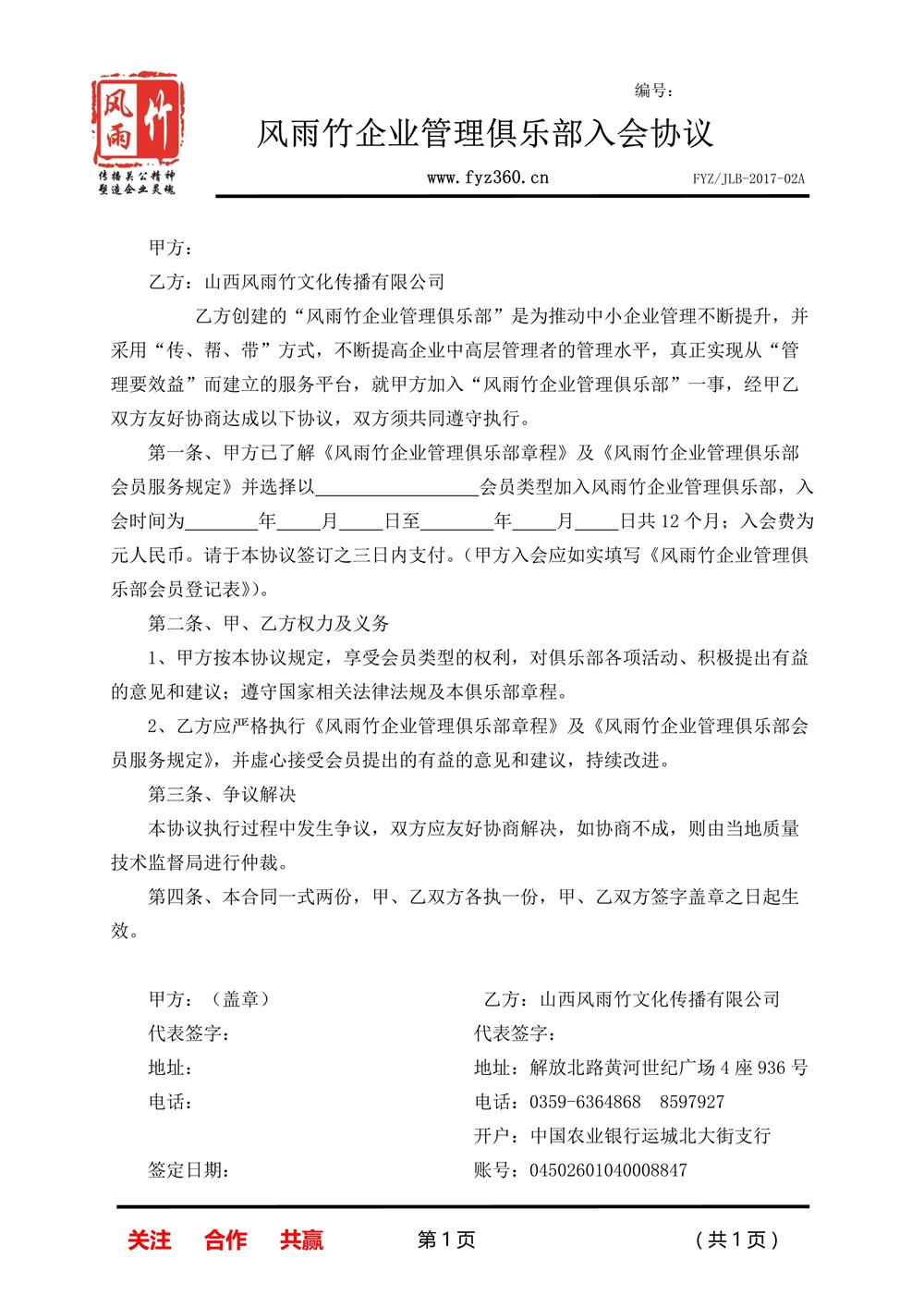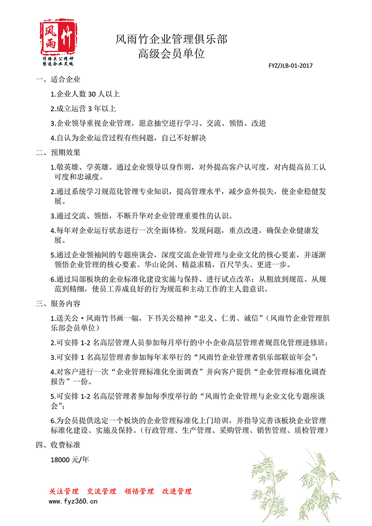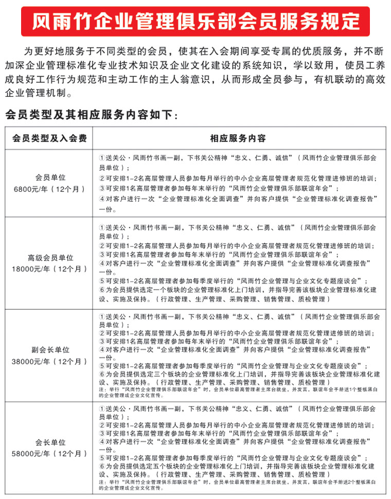 七、入會(huì)資格 愿意共同促進(jìn)企業(yè)管理水平提升,愿意參與俱樂(lè)部各類(lèi)服務(wù)活動(dòng),遵守俱樂(lè)部章程,會(huì)員單位資料齊全,并與本公司簽訂“風(fēng)雨竹企業(yè)管理俱樂(lè)部入會(huì)協(xié)議”,繳納會(huì)費(fèi)后, 即為本俱樂(lè)部會(huì)員單位。