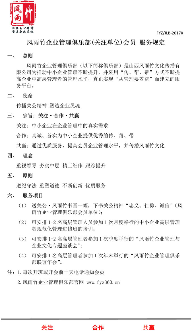 共贏(yíng):通過(guò)優(yōu)質(zhì)服務(wù),提高會(huì)員企業(yè)管理水平,并傳播風(fēng)雨竹文化