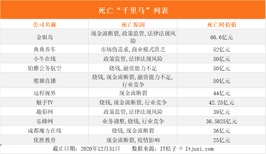世有伯樂,然后有千里馬。但千里馬未必定是良駒。我們調(diào)取了 IT 桔子死亡公司數(shù)據(jù)庫,發(fā)現(xiàn)死亡名單中也有不少「前千里馬」的身影。我們選取了死亡千里馬名單中估值排名前十的企業(yè)制成上表。