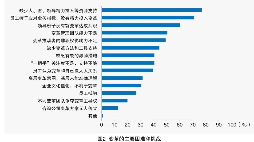 調(diào)研報(bào)告顯示,影響企業(yè)變革的主要困難和挑戰(zhàn)依次為(如圖2所示):