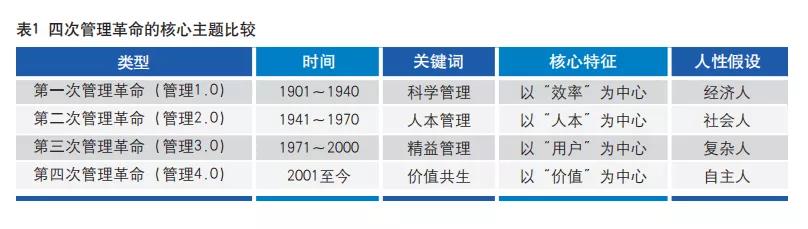 從“效率第一”到“價值第一”,管理學走過了一百多年的歷史,不斷推動從“經(jīng)濟人”到“自主人”的跨越。見表1。