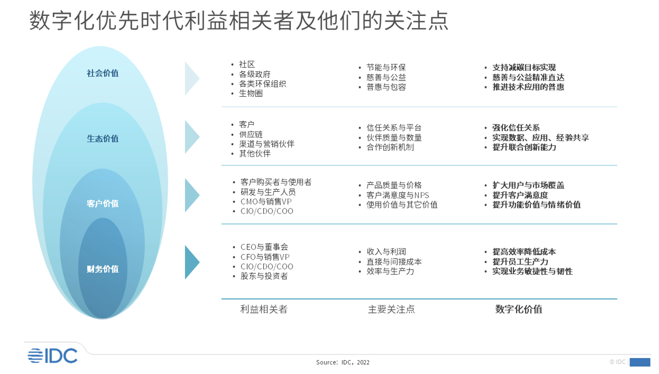 數(shù)字化優(yōu)先不是單純的技術(shù)或商業(yè)模式,而是企業(yè)的一種遠(yuǎn)景,一種對數(shù)字技術(shù)價值的認(rèn)可、期待和行動。數(shù)字化優(yōu)先時代要求規(guī)模化創(chuàng)新可持續(xù)化、情景化、實(shí)時化。數(shù)字化優(yōu)先也在重新定義數(shù)字化的價值:財(cái)務(wù)價值、客戶價值、生態(tài)價值、社會價值。