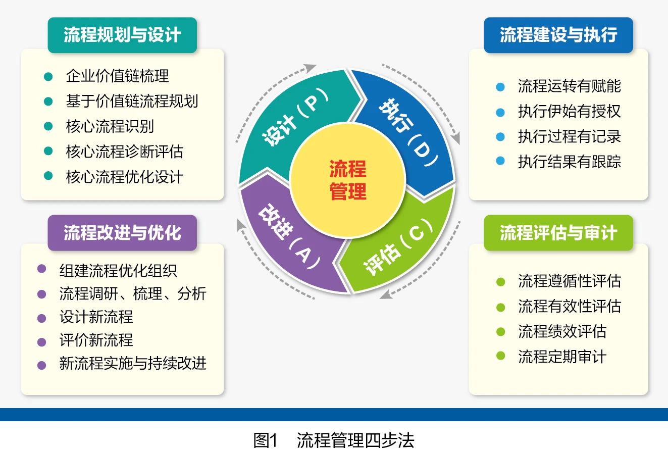 流程管理四步法由設(shè)計(jì)、執(zhí)行、評估、改進(jìn)組成一個完整循環(huán),如圖1所示。